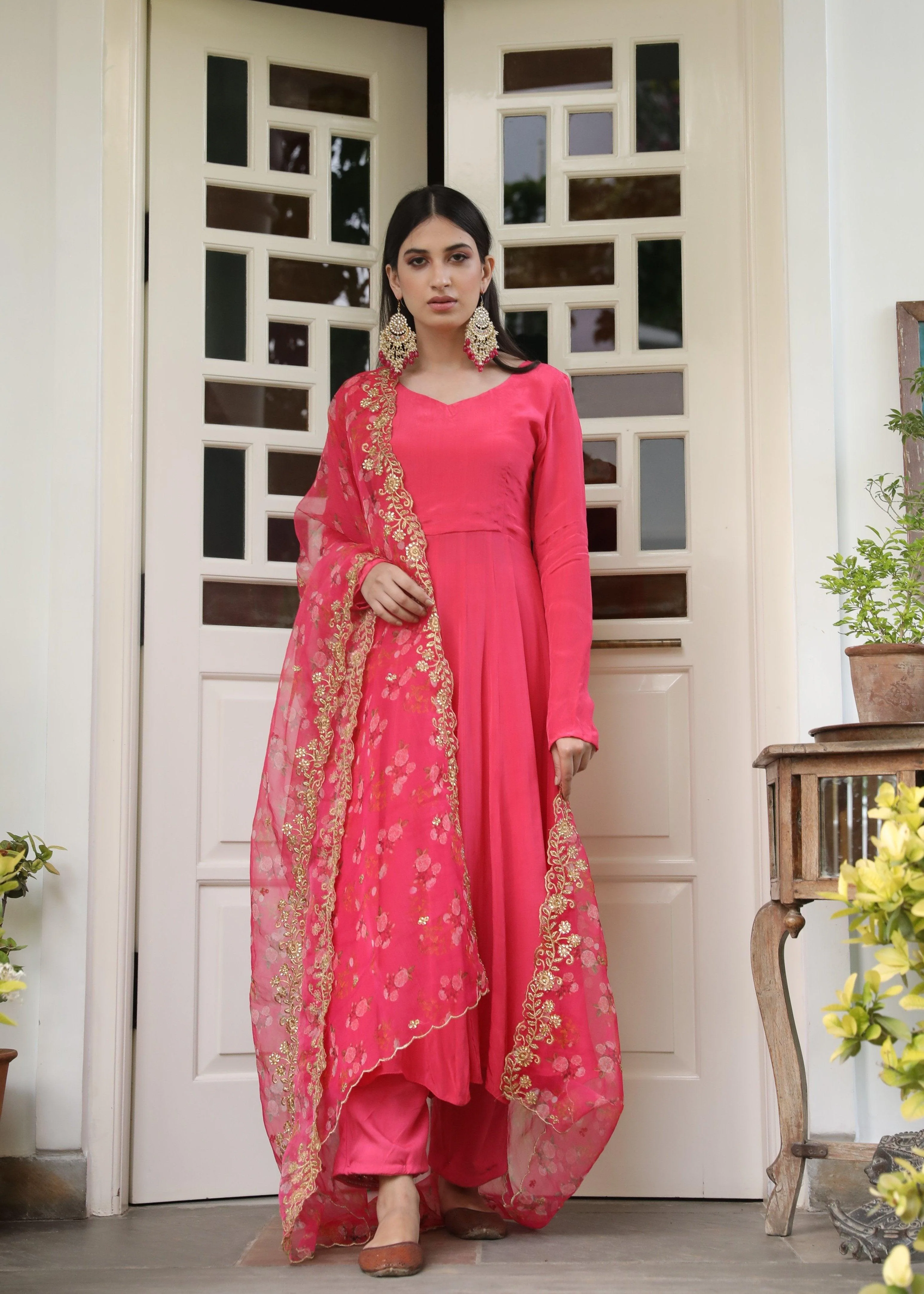 This three-piece set includes Anarkali, pants, and dupatta. Pink Satin crepe Anarkali paired with Pink pants with elasticated waist. Pink floral printed organza dupatta with work detailing and scalloping.