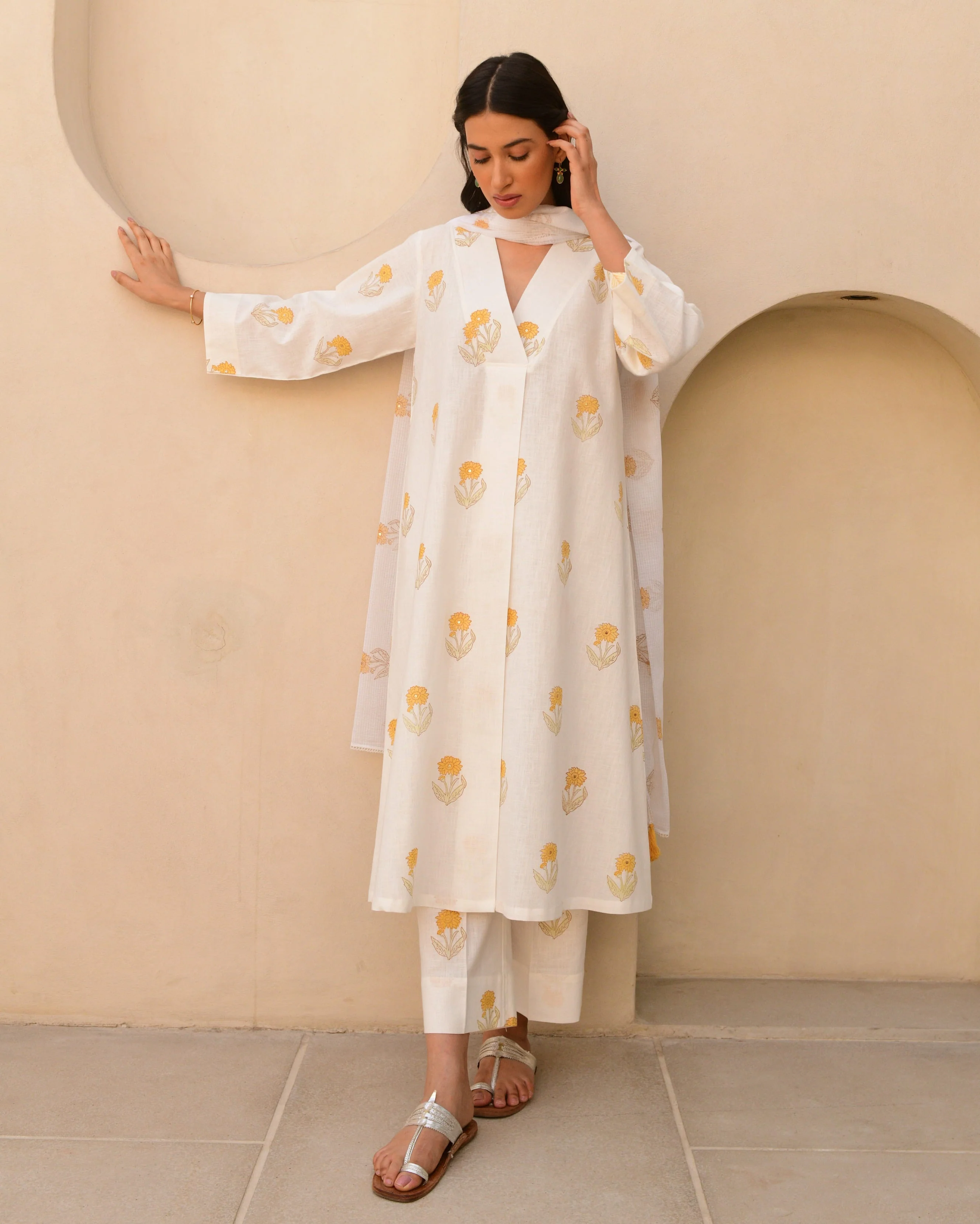 This three-piece set includes a kurta, pants, and a dupatta. High-quality handblockprinted cotton Kurta and matching linen pants . Doria dupatta with gotta detailing.