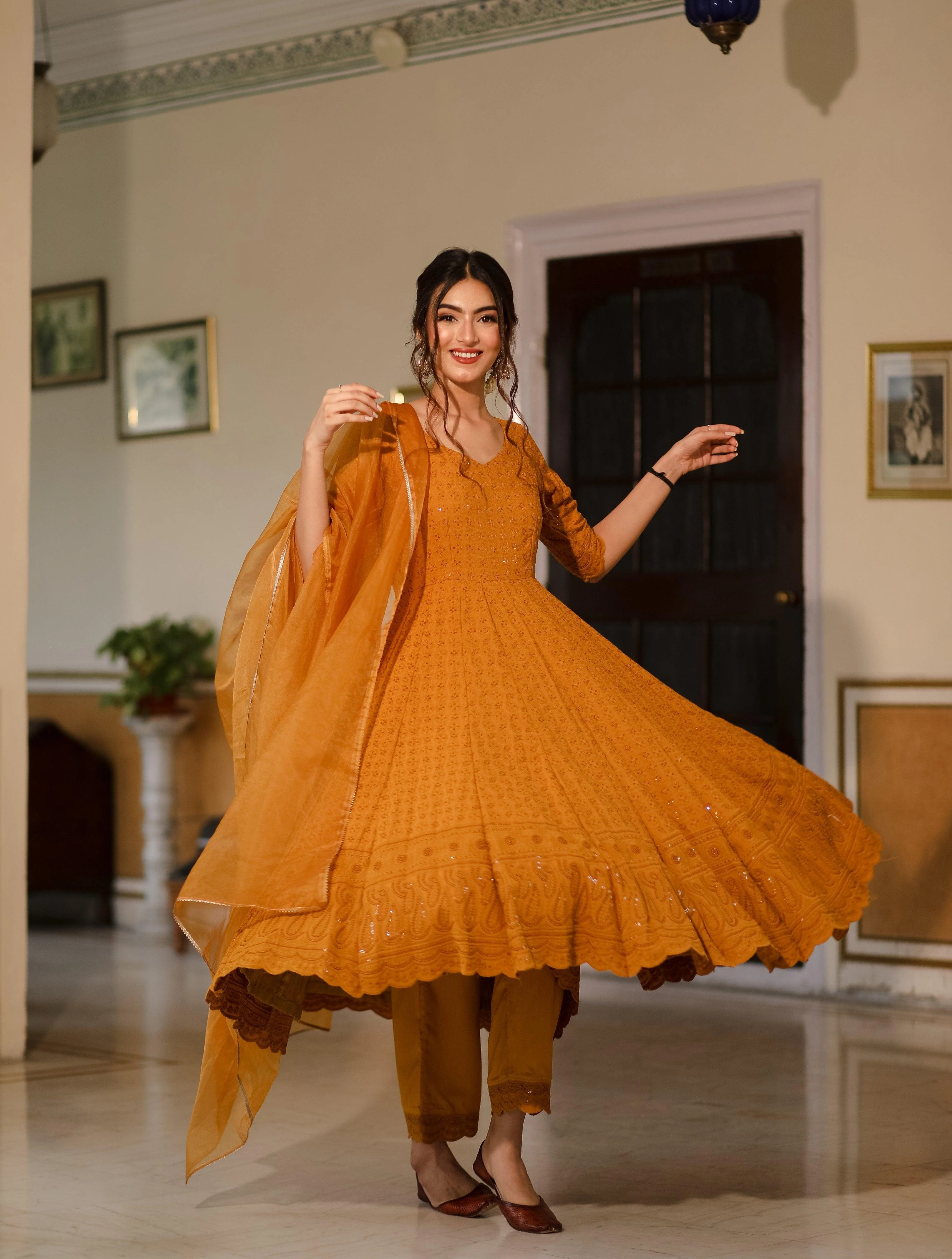 This three-piece set includes Anarkali, pants, and dupatta. Mustard rayon Anarkali with all over embroidery work. Mustard pants with elasticated waist. Mustard organza dupatta with gota detailing.