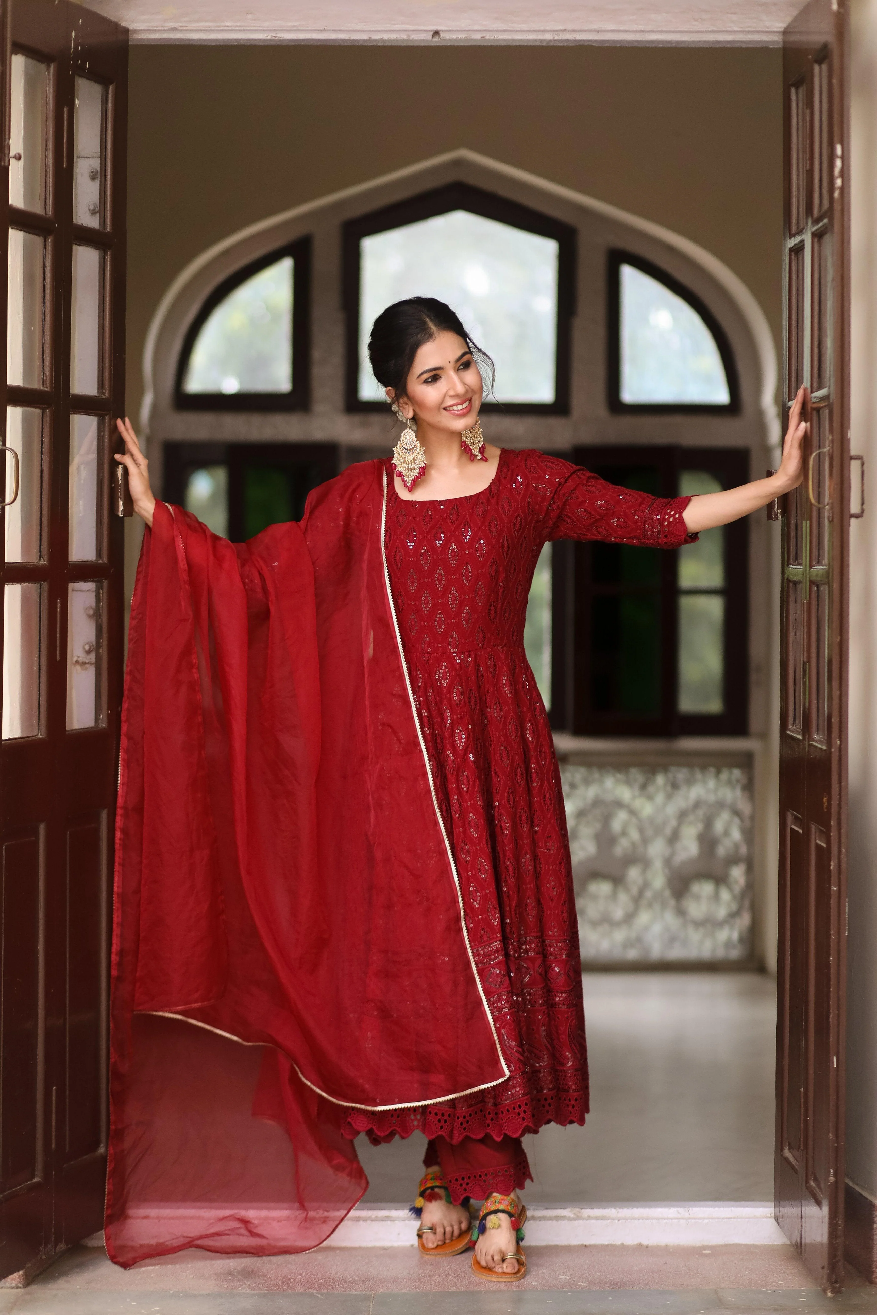 This three-piece set includes Anarkali, pants, and dupatta. Maroon rayon Anarkali with all over embroidery work. Maroon pants with elasticated waist. Maroon organza dupatta with gota detailing.