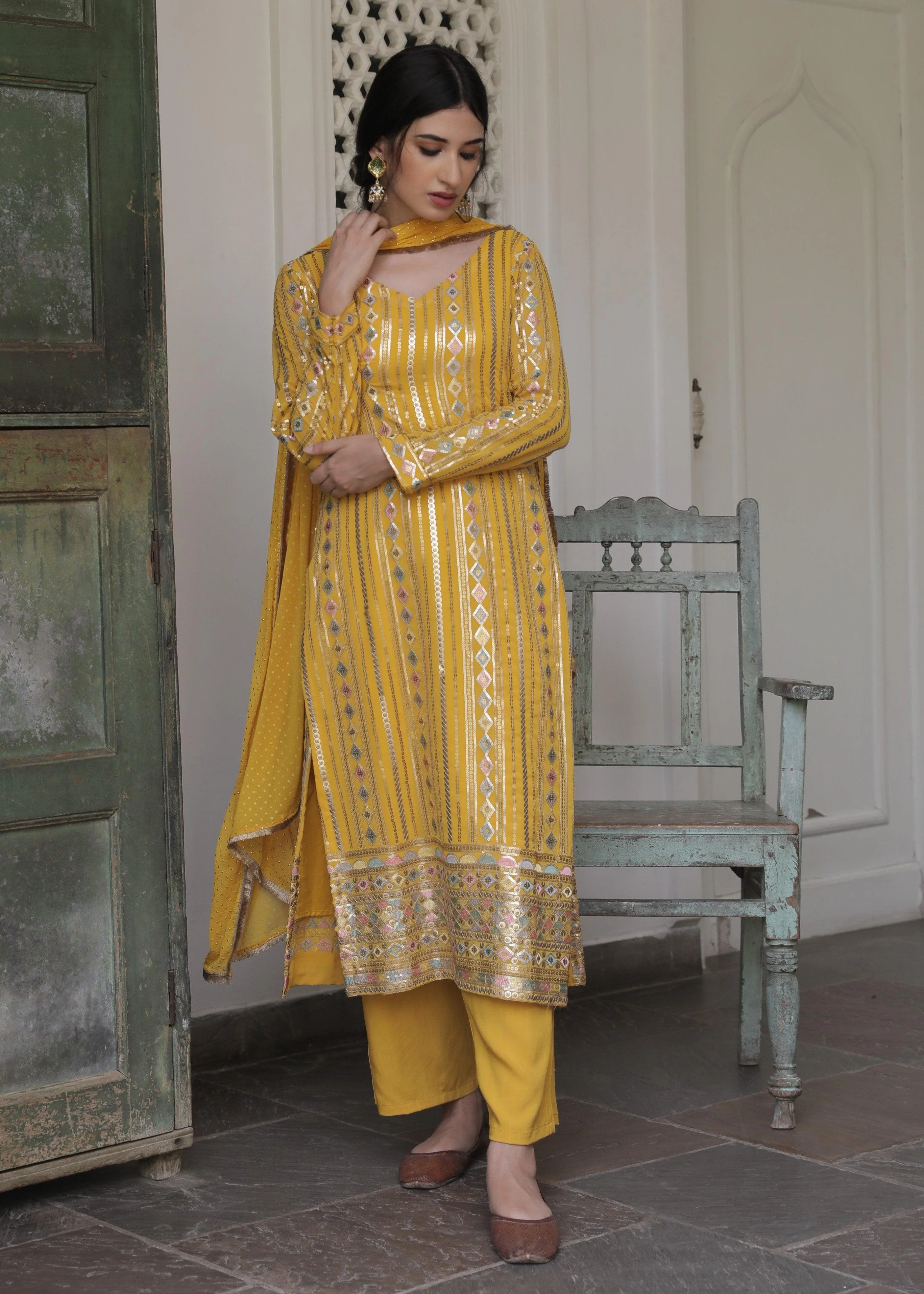 This three-piece set includes Kurta, pants, and dupatta. Aureolin Yellow Pure-Georgette Straight kurta with all over embroidery. Aureolin Yellow Modal Cotton pants with elasticated waist. Aureolin Yellow chiffon Mukaish & Foil dupatta with gotta detailing.