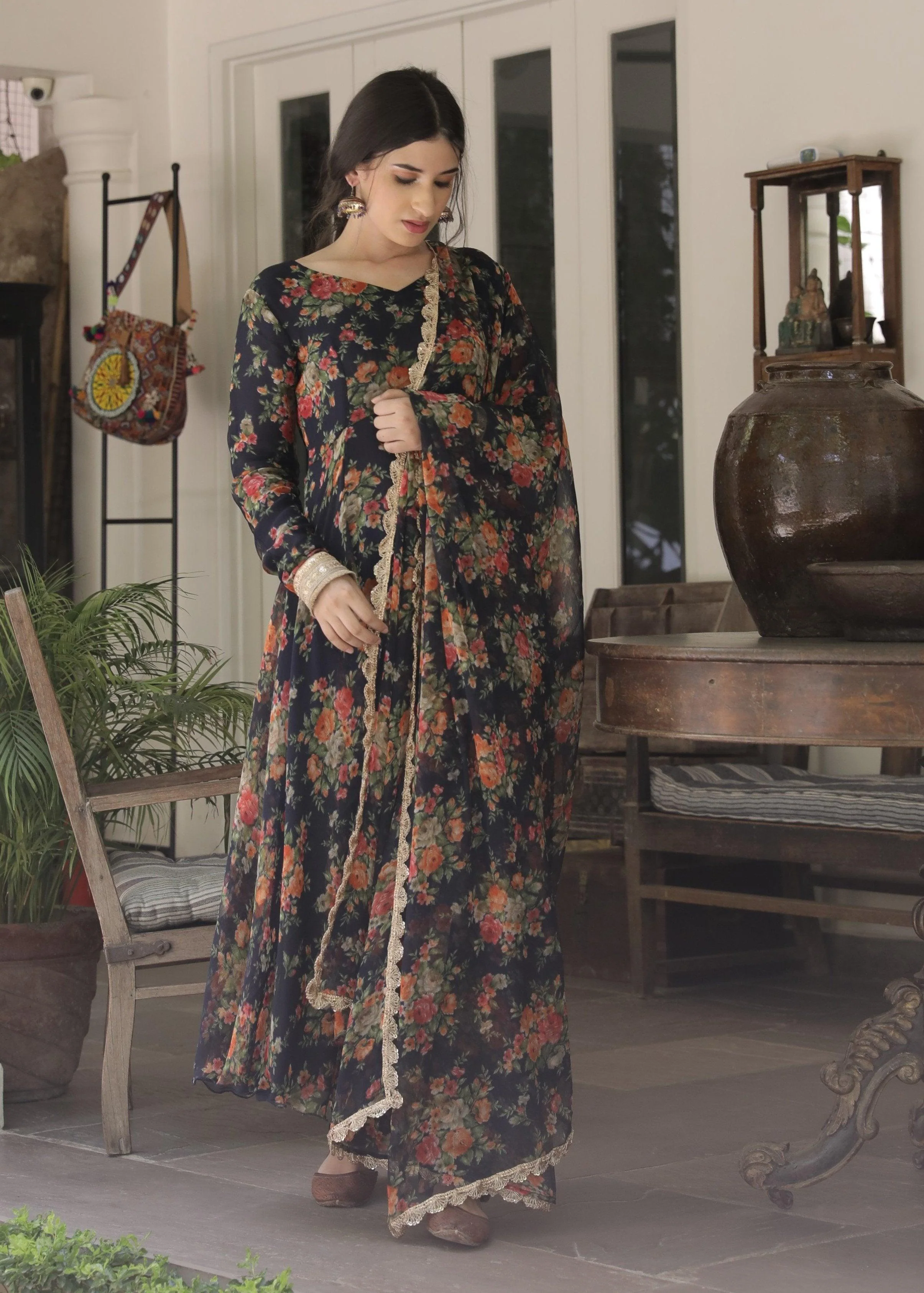 This three-piece set includes Anarkali, pants, and dupatta. Khwabeeda Midnight blue anarkali in our classic printed georgette chiffon with zari & lace hand-work detailings. Midnight blue georgette chiffon pants with elasticated waist. Midnight blue georgette chiffon dupatta with Zari work detailing on the edges.