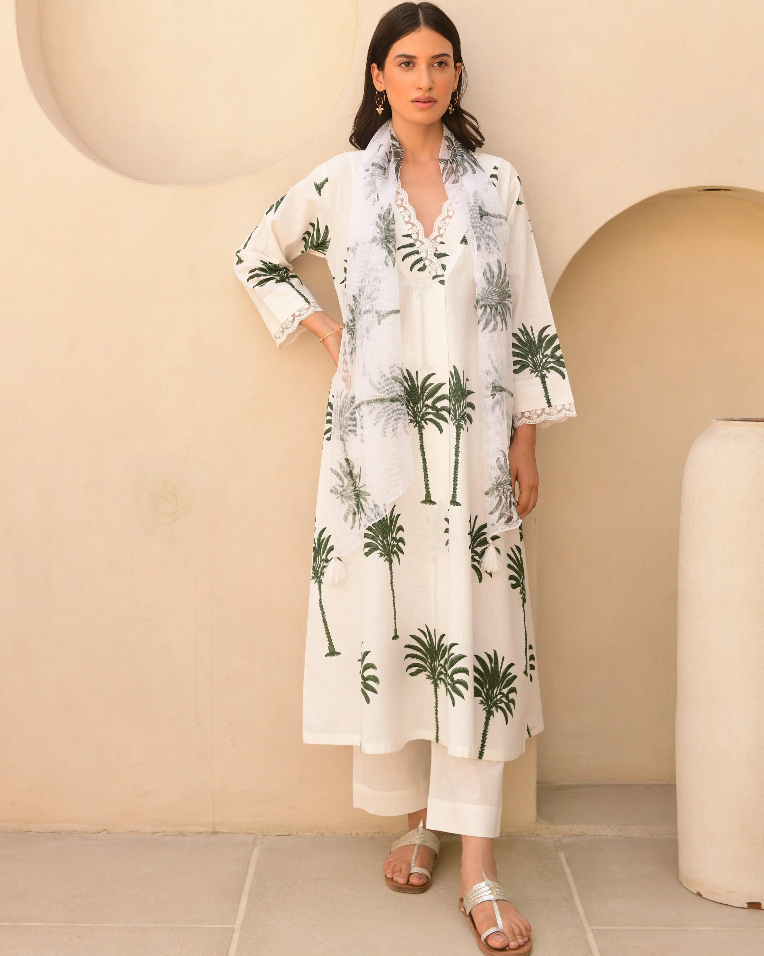 COTTON PALMS- Escape to a tropical paradise this summer with our handblock-printed palm trees on organic cotton. Soft, breathable, and effortlessly chic, these timeless pieces transport you to a haven of serenity and elegance, perfect for warm weather escapades.".