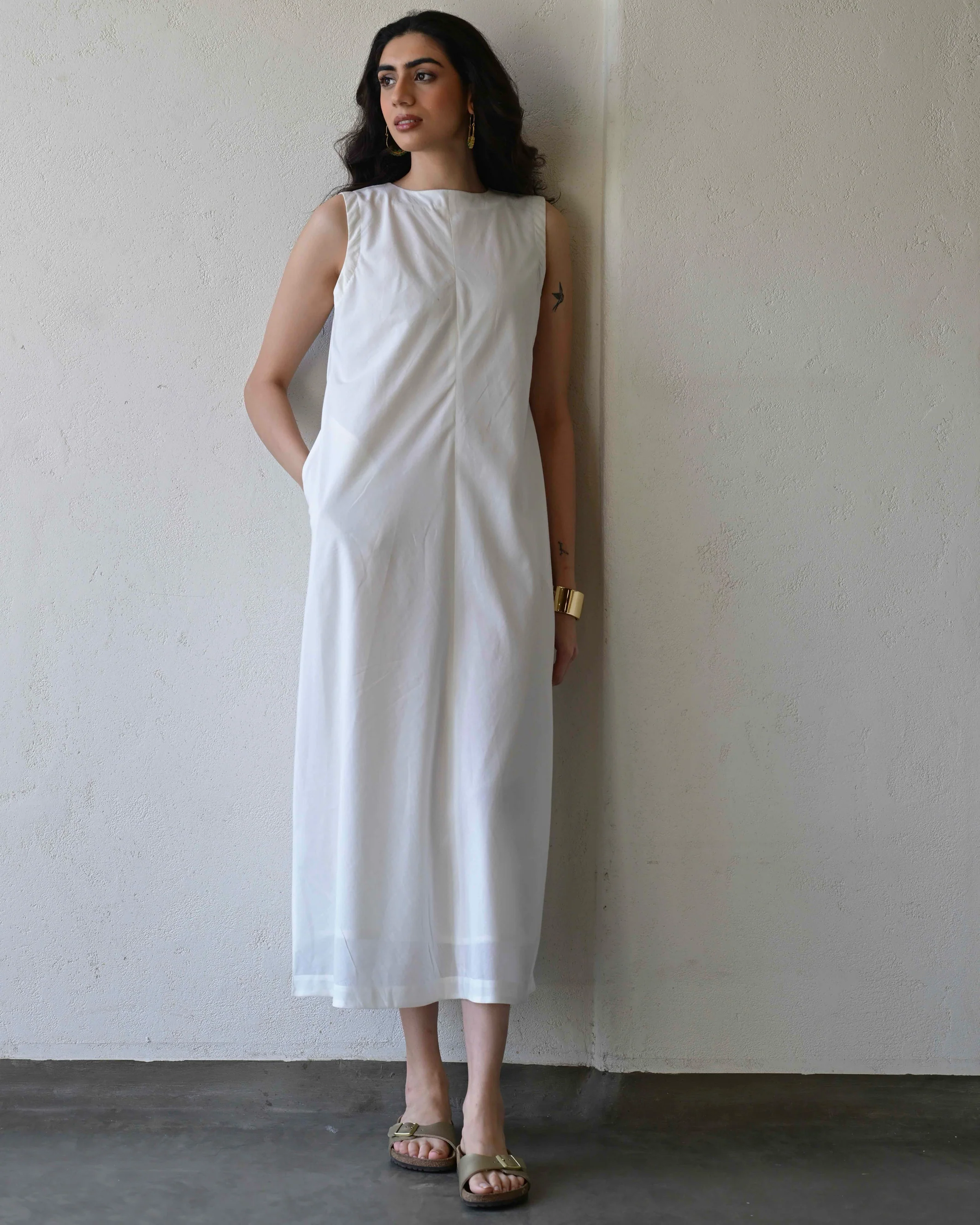 This two-piece set includes a organic cotton relaxed dress with soft mulmul inner lining . All-white organic cotton dress designed for an airy, breathable summer feel.