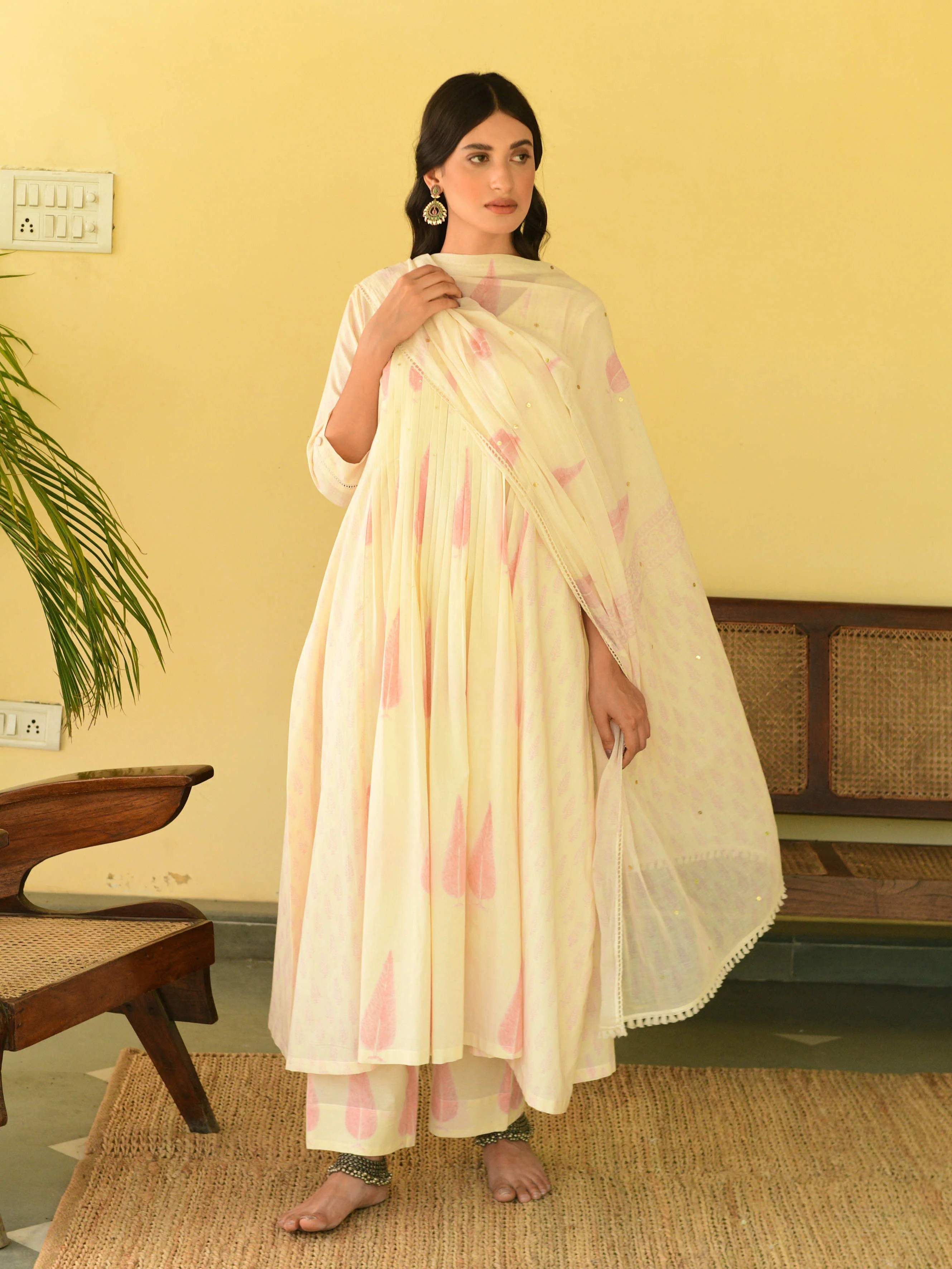 This three-piece set includes Pintuck anarkali, pants, and dupatta. Mulmul cotton block printed pintuck anarkali with handwork detailing. Pants has elasticated waist and Mulmul cotton handblock printed dupatta.