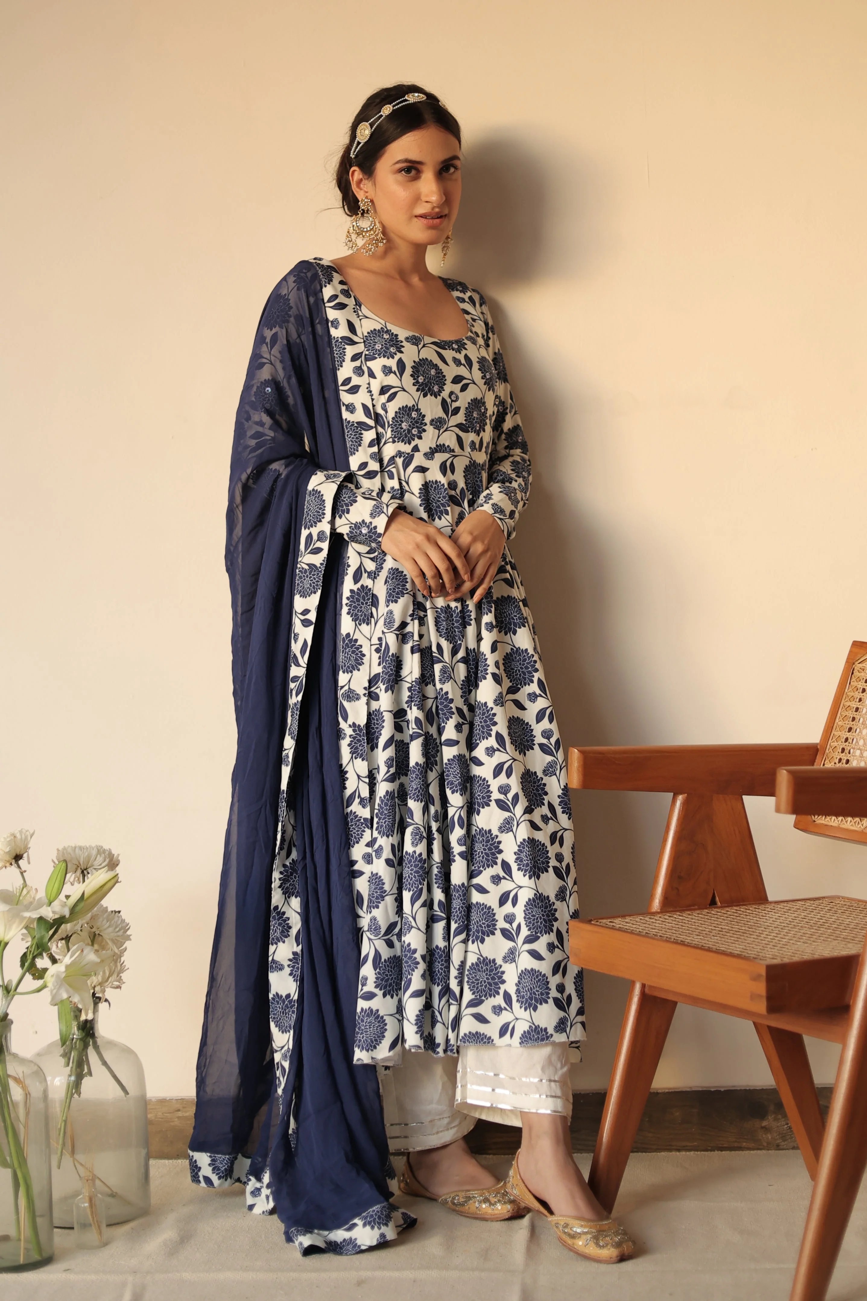 This three-piece set includes Anarkali, pants, and dupatta. Mayera anarkali in our classic printed fine Modal with gotta detailing. modal Pants has elasticated waist and dupatta with foil detailings.