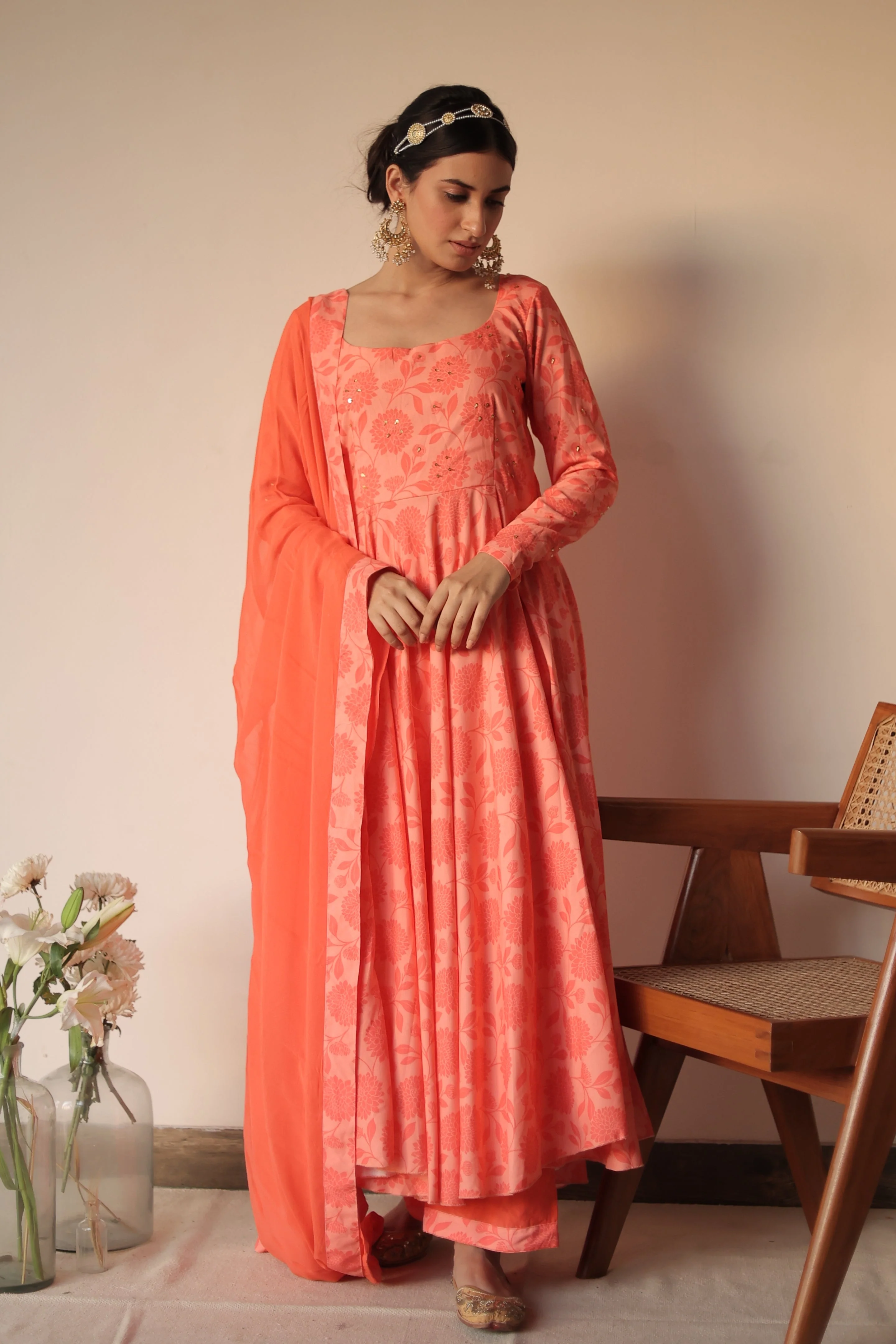 This three-piece set includes Anarkali, pants, and dupatta. Mayera coral anarkali in our classic printed Modal with gotta detailing. Modal Pants has elasticated waist and dupatta with foil detailings.