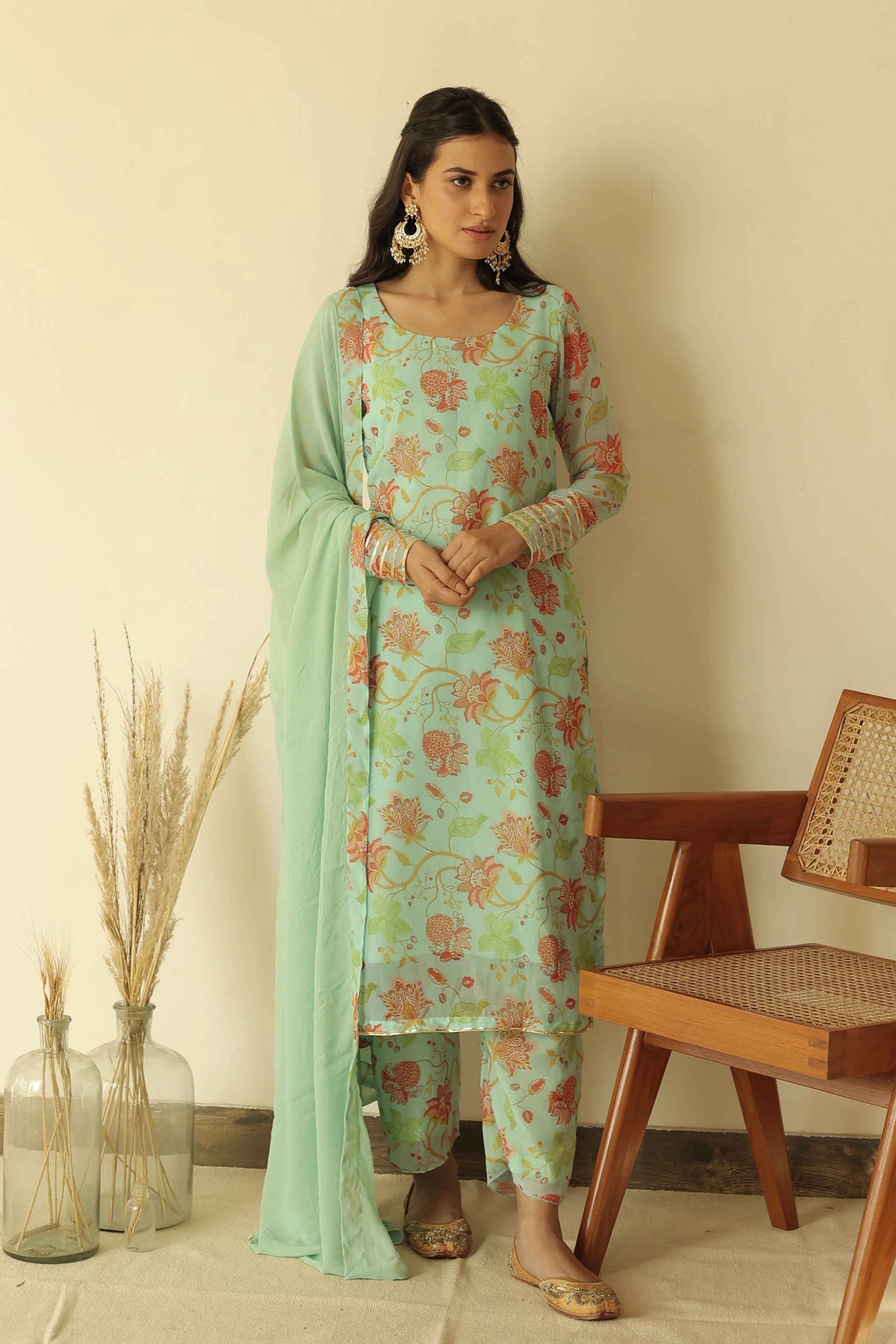 This three-piece set includes Kurta, pants, and dupatta. Zaheen Kurta in our classic printed georgette with gotta detailing. Georgette Pants has elasticated waist and dupatta with foil detailings.